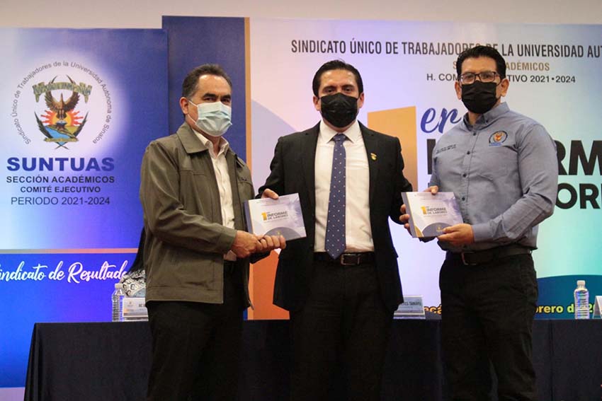 Aceves Tamayo, hizo entrega del Primer Informe del periodo 2021-2024 al Rector de la UAS y al presidente de la Comisión Autónoma de Vigilancia e hizo el compromiso de seguir trabajando con ética, transparencia y ser un sindicato de resultados.