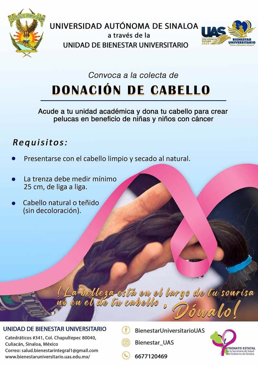 La Universidad Autónoma de Sinaloa a través de la Unidad de Bienestar Universitario convoca a la colecta de cabello para la elaboración de pelucas oncológicas, la directora de la UBU, MC Sofia Angulo de Madueña, informó que dicha donación se estará entregando al Patronato Estatal de la Secretaría de Salud de Gobierno del Estado dirigido por la MC Angélica Díaz de Cuén, quien invita a la sociedad en general a unirse a esta causa.