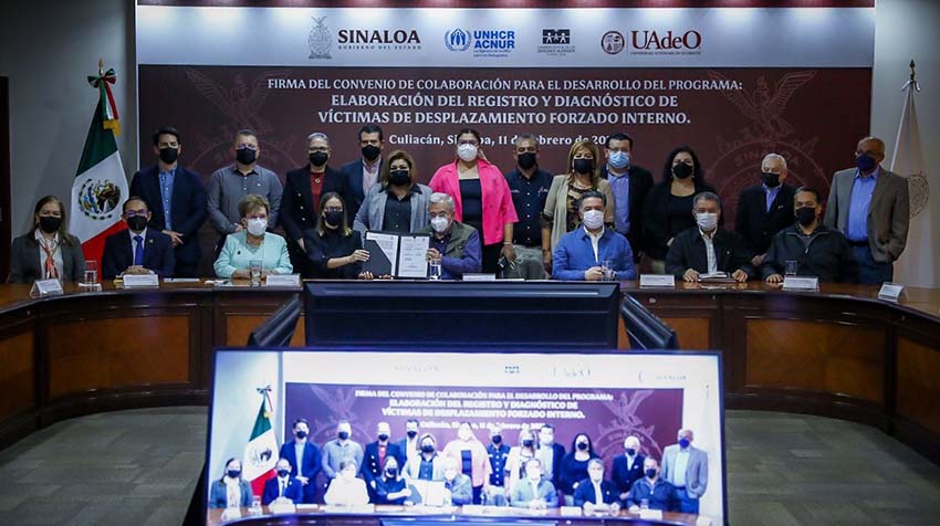 El gobernador Rubén Rocha Moya signó con la rectora de la Universidad Autónoma de Occidente, Sylvia Paz Díaz Camacho, el convenio para la elaboración del Registro y Diagnóstico de Víctimas de Desplazamiento Forzado Interno, que fue atestiguado por el presidente de la Comisión Estatal de Derechos Humanos de Sinaloa, José Carlos Álvarez Ortega, y por el representante de la Oficina del Alto Comisionado de las Naciones Unidas para los Refugiados, Josep Herreros, este último a través de una video conferencia, al igual que los representantes de los diversos colectivos que existen en el estado.