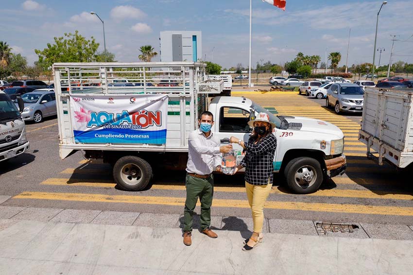 Fue la directora general de DIF Sinaloa, Dra. Alejandra Miranda Félix, quien recibió la donación y dio el banderazo de salida de los camiones que llevaran agua al municipio de Badiraguato y sus comunidades.
