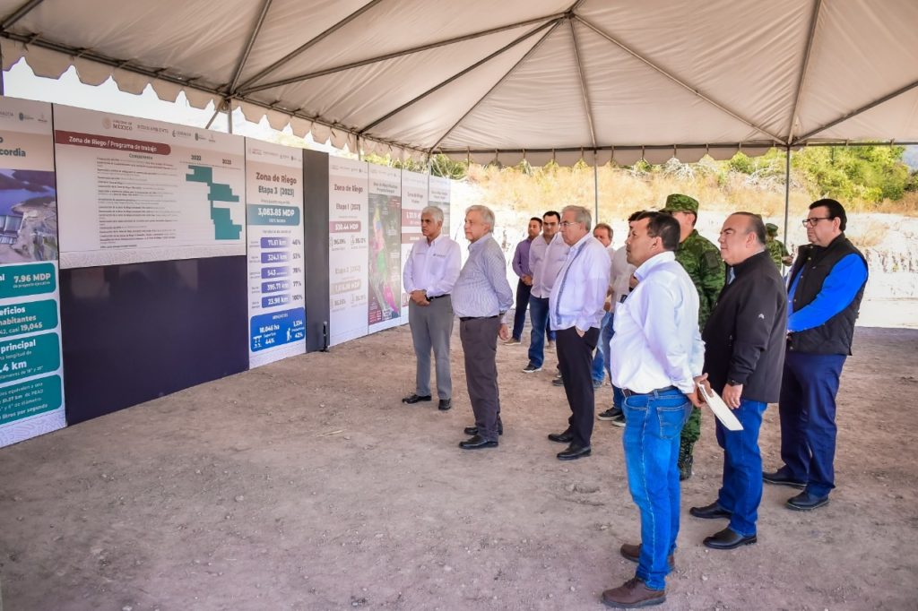 Sobre el trabajo de la zona de riego, esta fue dividida en tres etapas, teniendo la primera en 2021 la cual contó con $530.44 MDP y que actualmente tiene un avance físico del 96.19% y uno financiero del 95.12%.
