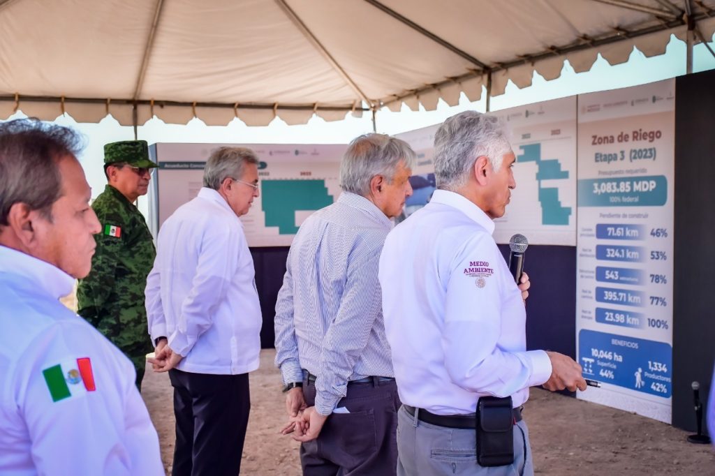 Por último para la tercera etapa de la zona de riego la cual comenzará a desarrollarse en 2023, el presupuesto requerido será de $3,083.85 MDP el cual será 100 por ciento federal, en la cual se trabajarán con los pendientes, los cuales constan de 71.61 km de canales principales equivalentes a un 46%, 324.1 km de red de distribución con 53 por ciento, 543 estructuras de control con 78 por ciento, 395.71 km de red de caminos con un 77% y 23.98 km de red de drenajes con un 100 por ciento del trabajo. Esta tercera etapa traerá beneficios para 10,046 hectáreas y 1,334 productores.