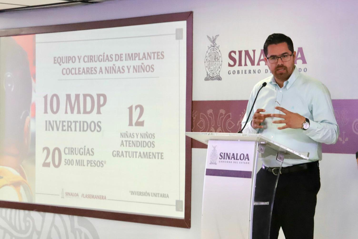 En cuanto al equipo y cirugías de implantes cocleares a niñas y niños sinaloenses, el también director general de los Servicios de Salud de Sinaloa expuso que se realizaron 20 cirugías con un costo de 500 mil pesos cada una, significando una inversión de 10 millones de pesos a beneficio de 12 niñas y niños que fueron atendidos gratuitamente.