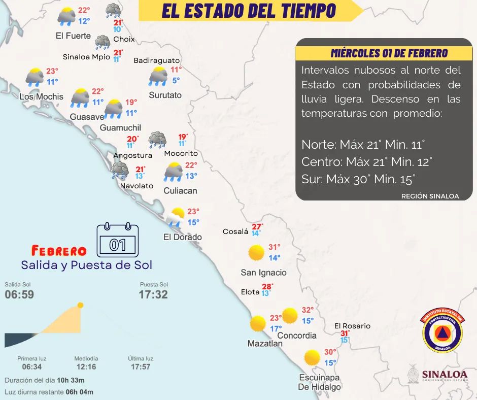 Por su parte, la masa de aire frío que impulsó al frente frío número 29 en interacción con el arrastre de humedad de la corriente en chorro subtropical y un canal de baja presión en el interior del país, propiciarán lluvias puntuales fuertes en Chihuahua, Durango y Sinaloa (norte), y chubascos en Baja California Sur y Coahuila, con probabilidad de caída de aguanieve y/o nieve en sierras de Chihuahua, Coahuila y Durango, así como rachas de viento de 70 a 90 km/h en el norte del país. Por otro lado, el frente frío Núm. 28 se desplazará lentamente sobre Tamaulipas y norte de Veracruz, ocasionará intervalos de chubascos en el noreste y oriente del país, con viento de componente “Norte” de 50 a 60 km/h y oleaje de 2 a 3 metros de altura en costas de esos estados.