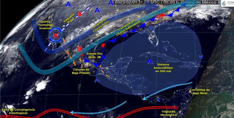 CIUDAD DE MÉXICO, a miércoles 1 de febrero de 2023. Para hoy, la quinta tormenta invernal continuará sobre el noroeste del país e interactuará con la corriente en chorro polar, generarán chubascos en Baja California y Sonora, ambiente muy frío a gélido, además de caída de aguanieve y/o nieve en sierras de dichos estados, con rachas de viento de hasta 50 km/h en dicha región.