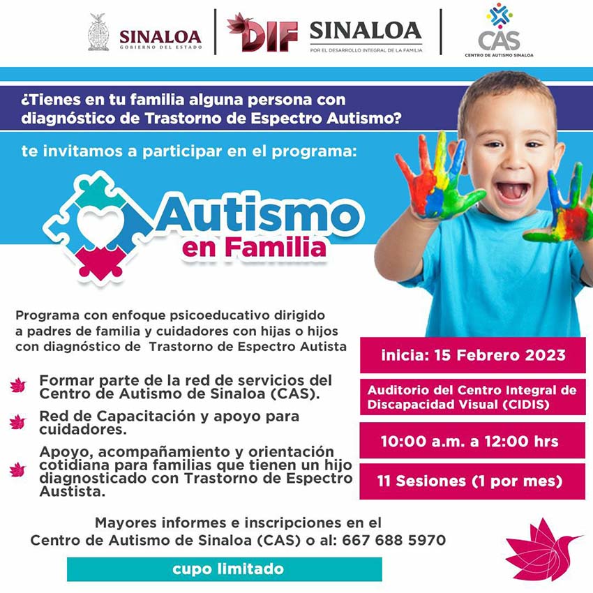 “CAS en Familia” es un programa psicoeducativo con contenido orientado para apoyo, acompañamiento y orientación a padres o cuidadores con algún familiar con diagnóstico de Trastorno de Espectro Autista; este programa es impulsado por la Doctora Eneyda Rocha Ruiz, presidenta del Sistema DIF Sinaloa y desarrollado por especialistas del Centro de Autismo de Sinaloa, consta de 11 sesiones las cuales se desarrollarán una vez al mes durante los meses de febrero a diciembre de 2023.