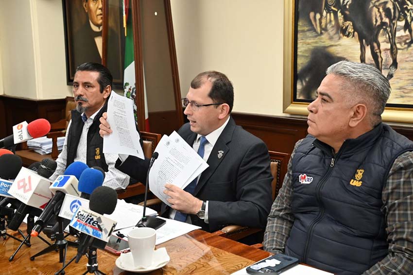 Acompañado del Vicerrector de la Unidad Regional Centro (URC), doctor Wenseslao Plata Rocha y del director general de Comunicación Social, ingeniero Arnoldo Valle Leyva, en conferencia de prensa presentó y entregó a los representantes de los medios de comunicación los documentos que desacreditan versiones que buscan desinformar a la opinión pública en este tema.