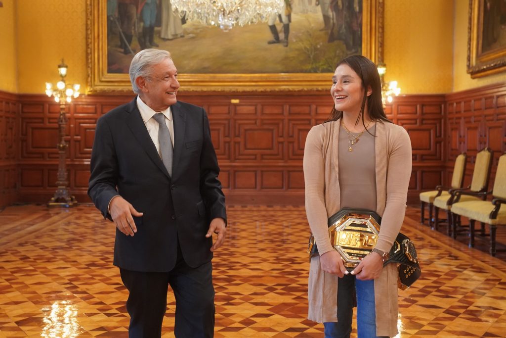 Ciudad de México, a miércoles 29 de marzo de 2023.- El presidente Andrés Manuel López Obrador recibió en sus oficinas a la nueva campeona mundial de la Ultimate Fighting Championship (UFC de artes marciales mixtas, la mexicana , Alexa Grasso.