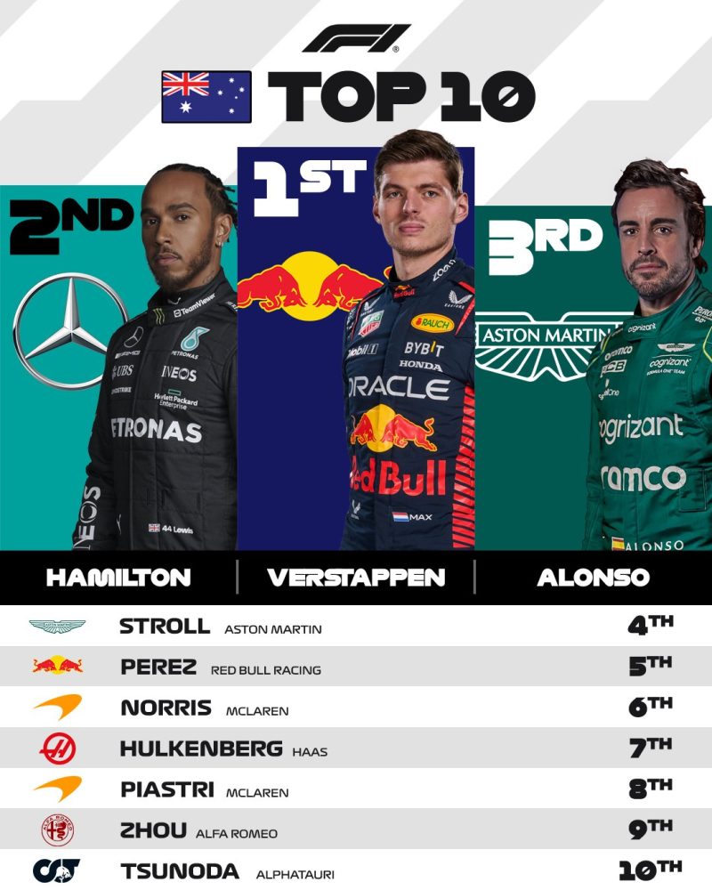 MELBOURNE, AUSTRALIA, a domingo 2 de abril de 2023.- En un accidentado Gran Premio de Australia, donde la polémica se presentó al final, Max Verstappen consiguió su segundo triunfo de la temporada, mientras que Sergio ‘Checo’ Pérez fue nombrado el piloto del día al conseguir la vuleta más rápida, subir 15 posiciones y terminar en el quinto peldaño luego de la sanción a Carlos Sainz tras su impacto con Fernando Alonso.