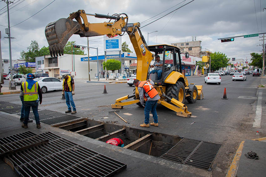 Como parte de este esfuerzo, el día de hoy las cuadrillas pertenecientes al Departamento de Conservación y Mantenimiento de Infraestructura realizaron obras de limpieza y desazolve en las rejillas del sistema de alcantarillado en el cruce de la avenida Álvaro Obregón y Aguilar Barraza.