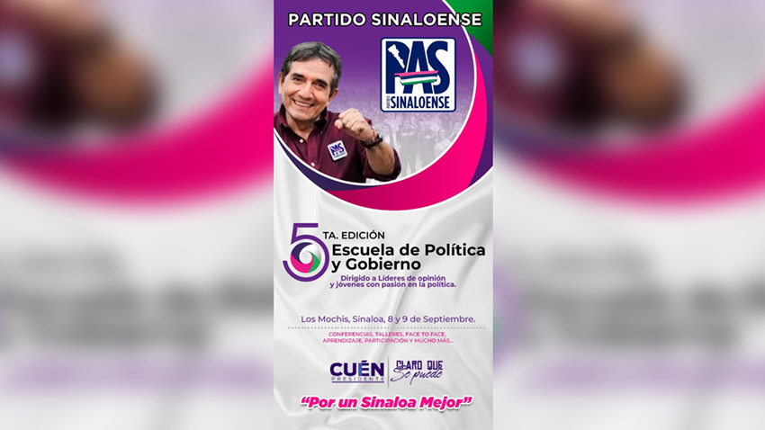 La 5ta edición de la Escuela de Política y Gobierno se encuentra lista la cual se llevará a cabo este 8 y 9 de septiembre en Los Mochis, Sinaloa. Cientos de PASistas se darán cita para capacitarse y estar listos para la contienda del 2024, a través de los 20 Comités Directivos Municipales se enviarán los mejores cuadros de cada municipio donde militantes, seccionales e integrantes de subcomités serán tomados en cuenta para participar en esta actividad que ha sido todo un éxito desde su origen aseguro el presidente del PAS Héctor Melesio Cuén Ojeda.