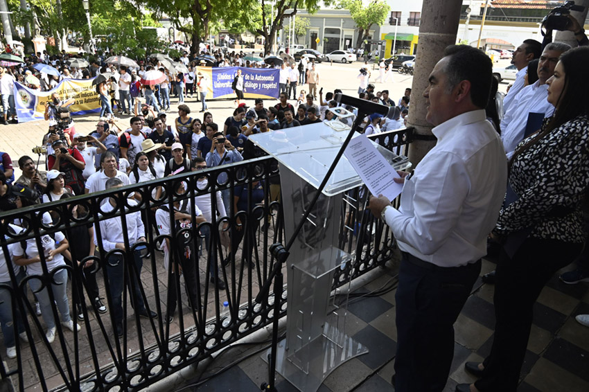 “Desde aquí la Universidad alza la voz, nuestra Autonomía, como sus libertades, no son un regalo sino un derecho ganado a pulso lo que nos debe motivar a defenderlos todo los días (…) hoy la UAS puede presumir a lo largo y ancho del país que en evaluaciones internacionales nos califican como la tercera universidad más importante de México”, expresó.