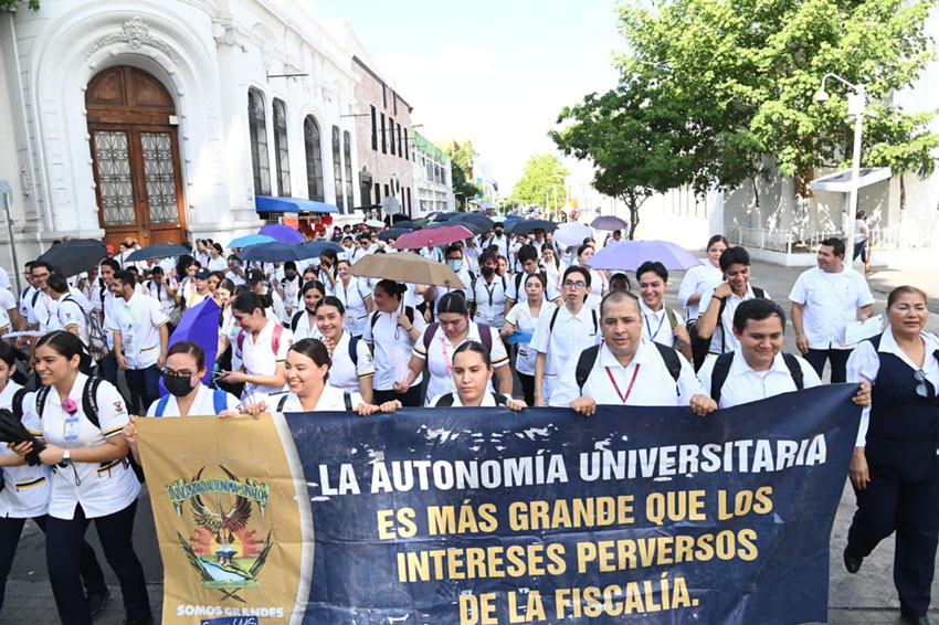 “Hoy debemos reflexionar y alzar la voz para que esos hechos represores del pasado no se repitan, porque la historia de gobiernos totalitarios están manchados de sangre y en Sinaloa hoy tenemos un gobierno totalitario, que tiene todos los poderes, que tiene todas las instituciones para perseguir a los que no estén de lado de ellos, por eso debemos alzar la voz, para que cese la persecución que se vive en el presente y evitar que se vuelva a vulnerar las autonomías de las universidades de México”, expresó el Rector desde los arcos del emblemático Edificio Rosalino que fue el punto de partida y llegada de los jóvenes marchantes.
