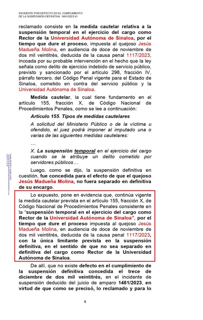 “Sin duda esta resolución viene a dar mucha claridad respecto del actuar del Consejo Universitario el cual determinó seguir manteniendo a un Encargado del Despacho (de Rectoría) y esto prevalece porque el propio Juez lo dice que mientras dure el proceso de amparo el doctor Jesús Madueña Molina no puede ser removido de su cargo como Rector”, expresó.