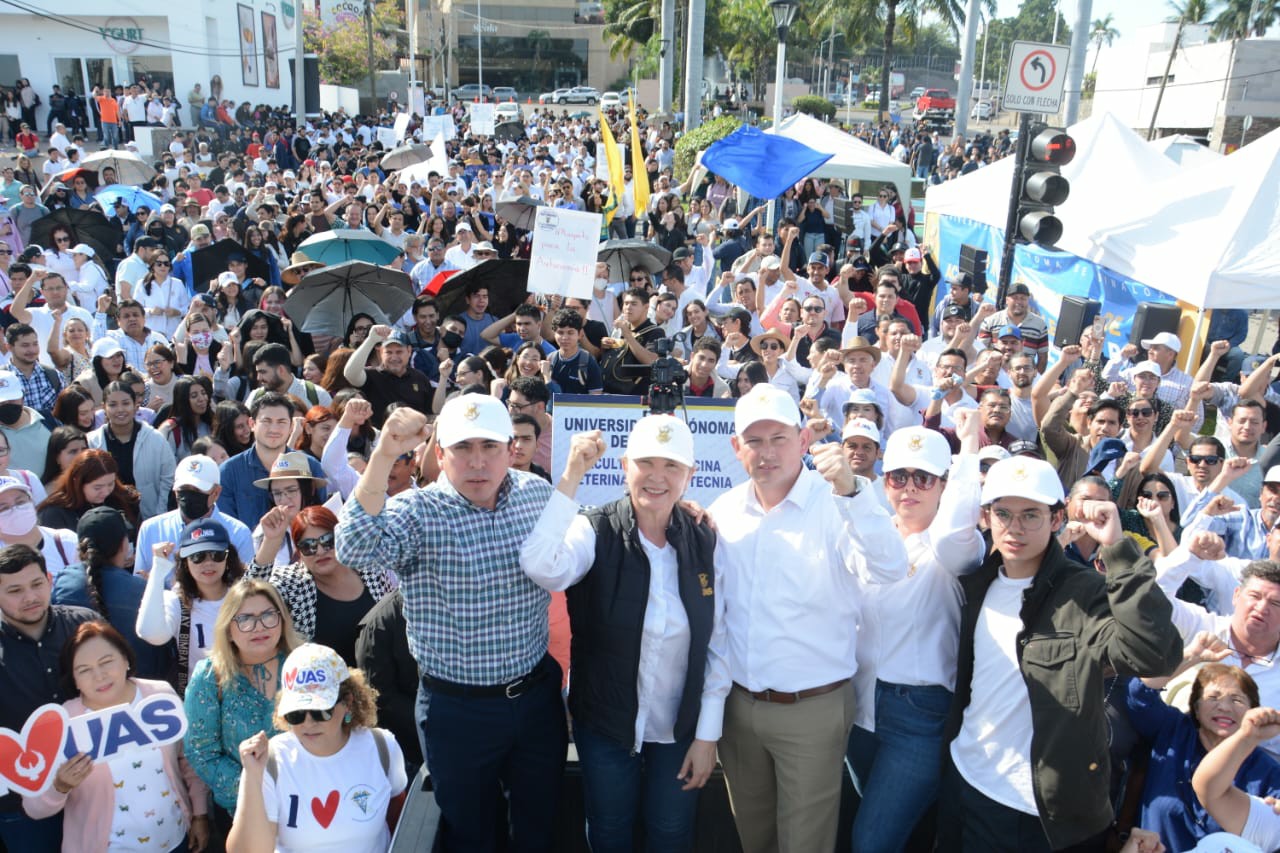 “¡Compañeros, el Presidente de la República cumple su palabra!”, fueron las palabras del Encargado del Despacho de Rectoría, doctor Robespierre Lizárraga Otero, durante la concentración masiva de estudiantes, trabajadores y docentes de las áreas agropecuarias y ciencias exactas este día en el cruce de la Avenida Álvaro Obregón y Boulevard Ciudades Hermanas.